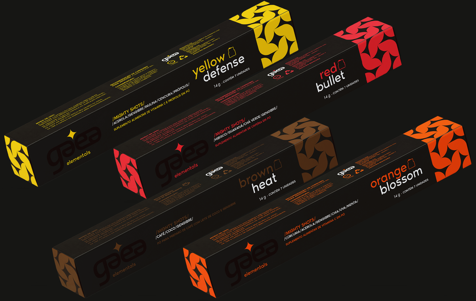 Criação de Logo, Identidade Visual e Embalagens para Gaea Elementals, marca Brasileira de shots funcionais.