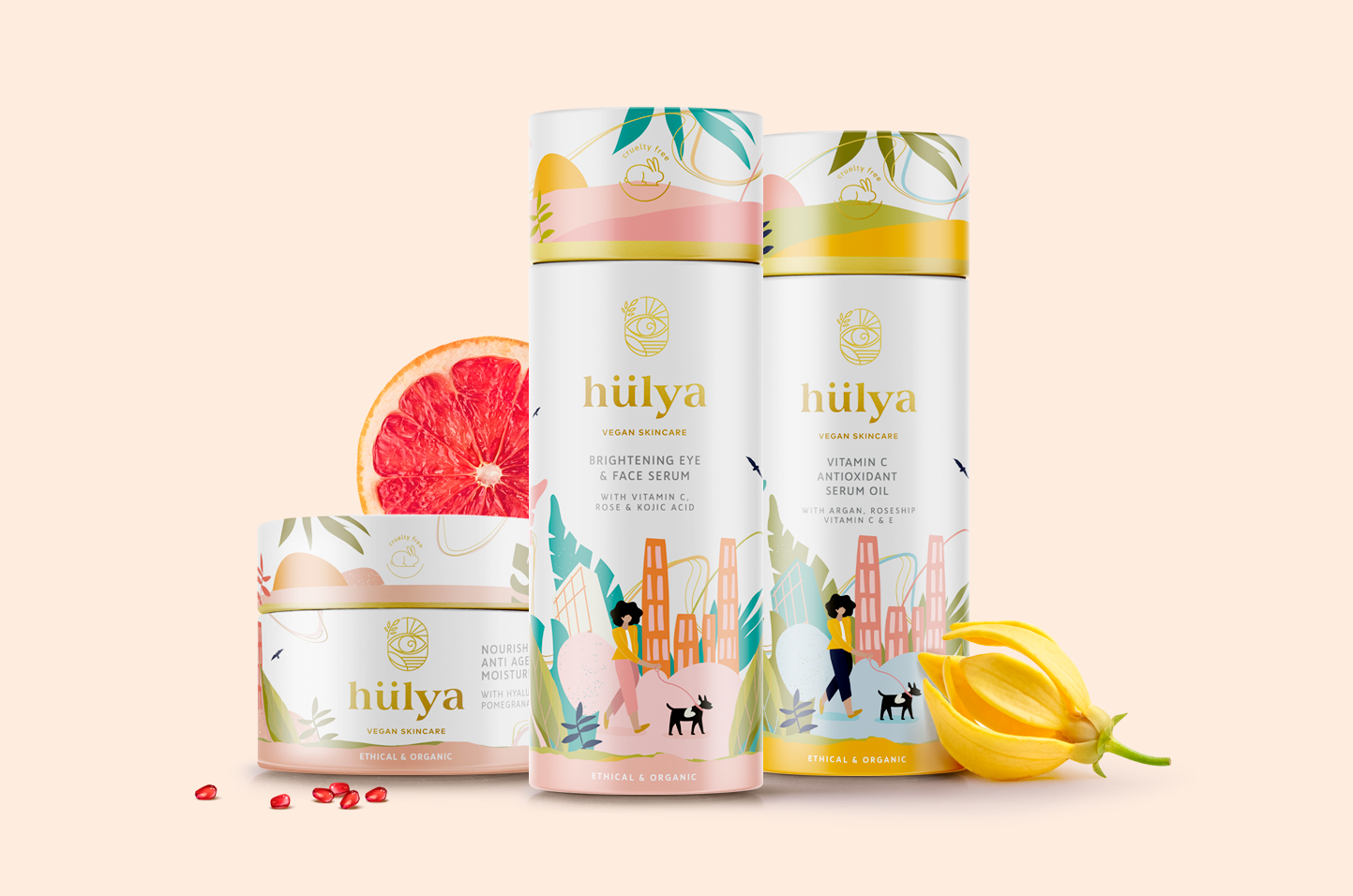 Criação de Logo, Identidade Visual e Embalagens para Hülya, marca Inglesa vegana de cuidados para a pele.
