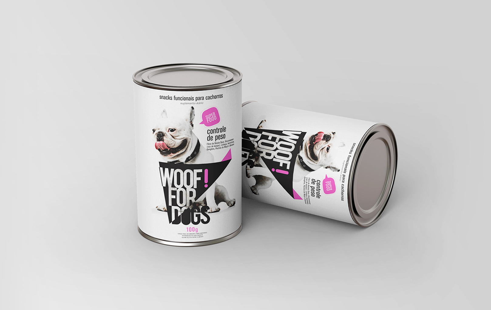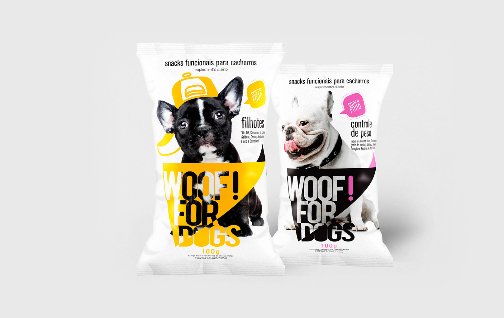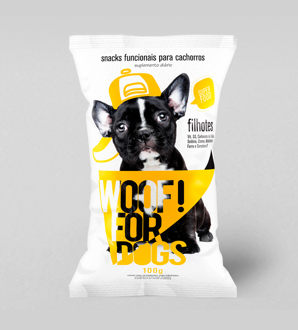 A linha Woof! for Dogs foi criada seguindo a tendência de mercado de “snacks funcionais para cachorros” Os elementos gráficos aplicados nas fotos representam a vertente cômica e carismática nas relações entre o dono e seu animação de estimação.